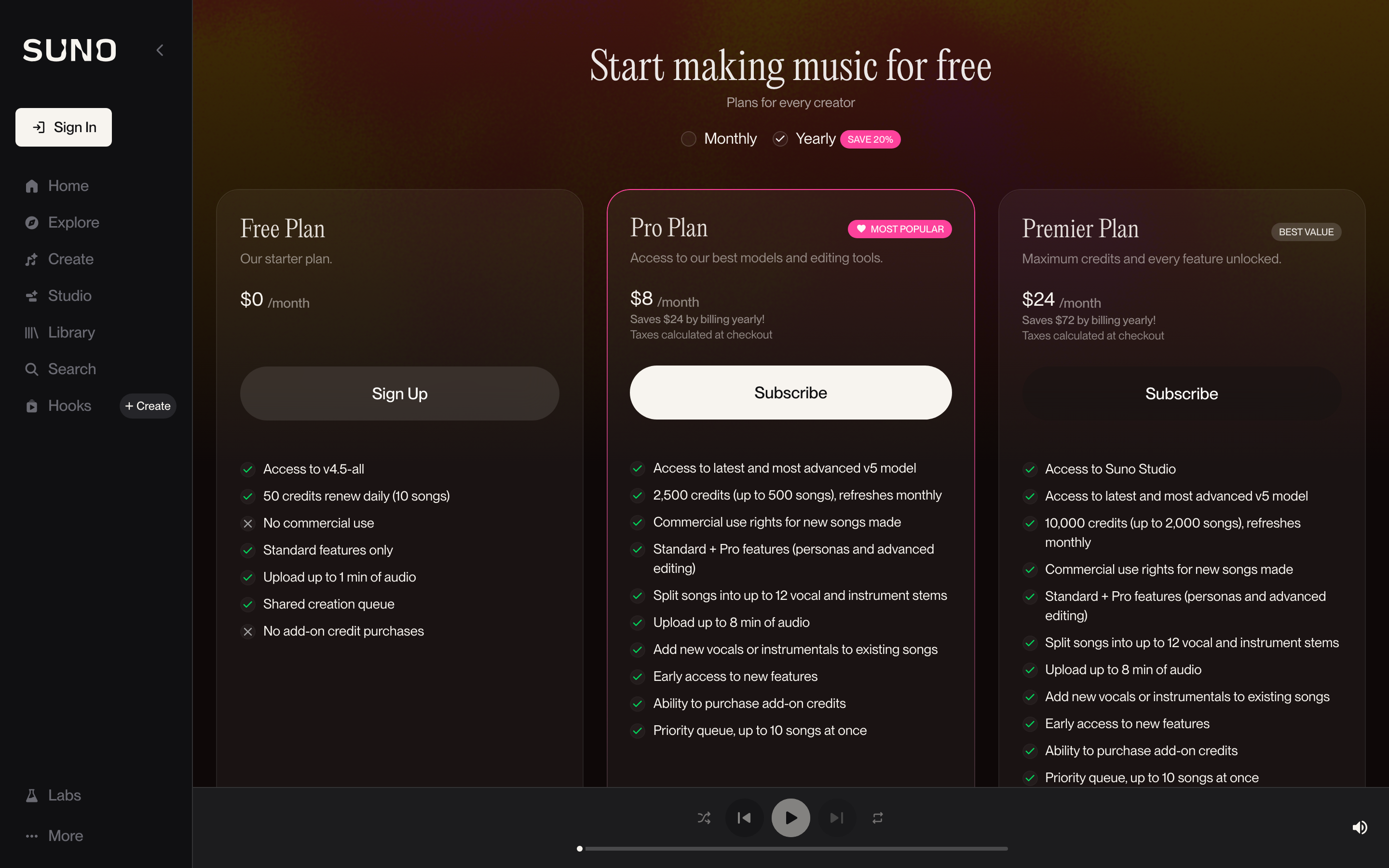 Suno Pricing Page