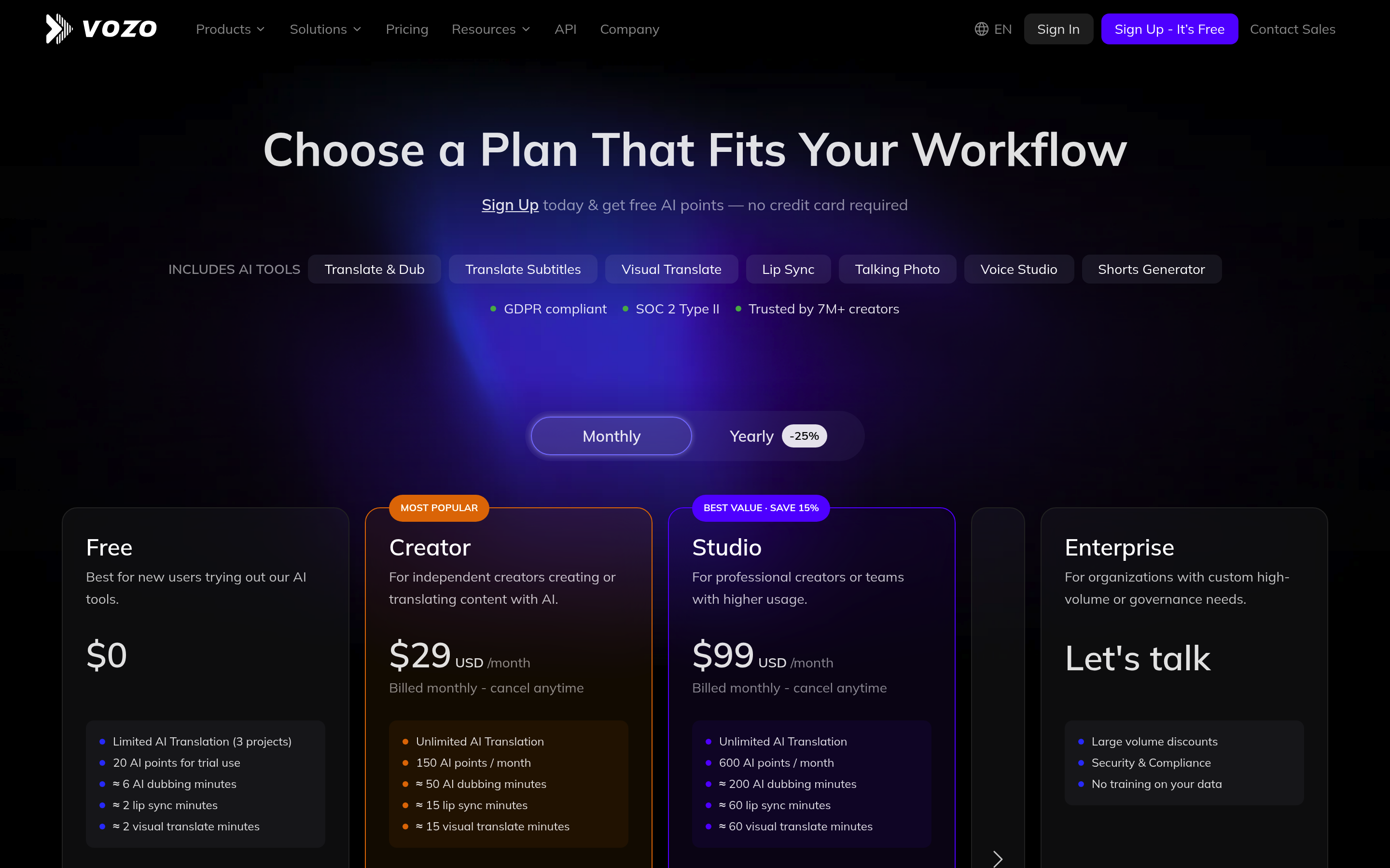 Vozo Rewrite & Redub Pricing Page